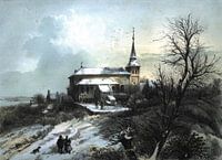Kleurenlithografie door Alexander Schaepkens van de parochiekerk van Kerkrade. Gepubliceerd in 1852, getiteld: Rolduc et ses Environs, dessinés d'après nature, et lithographiés par…