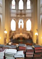 Stapels boeken in de kerk van Oss, Noord-Brabant, Nederland