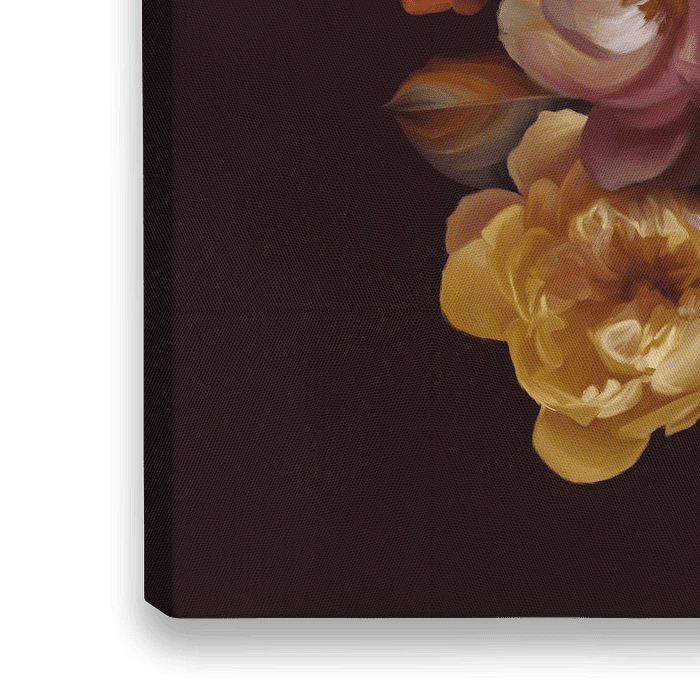 Boeket "Gradeur chique", digital art. Met dit boeket aan je muur heb je echt iets aparts. De kleuren zijn zorgvuldig op elkaar afgestemd en de achtergrond is zo donkerrood, dat hij bijna zwart is. Als je goed kijkt zie je dat deze tint véél sterker is dan "gewoon" zwart.