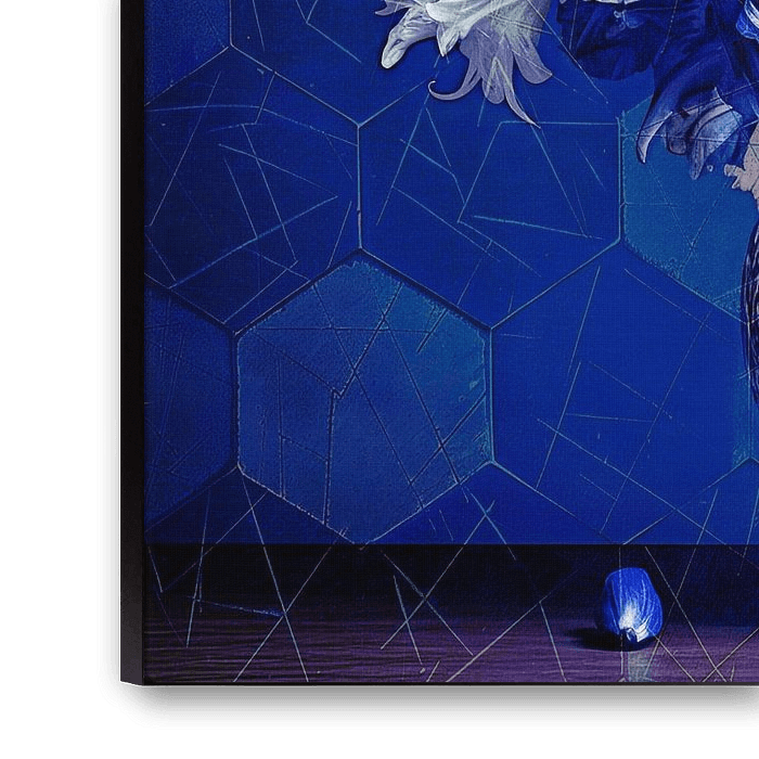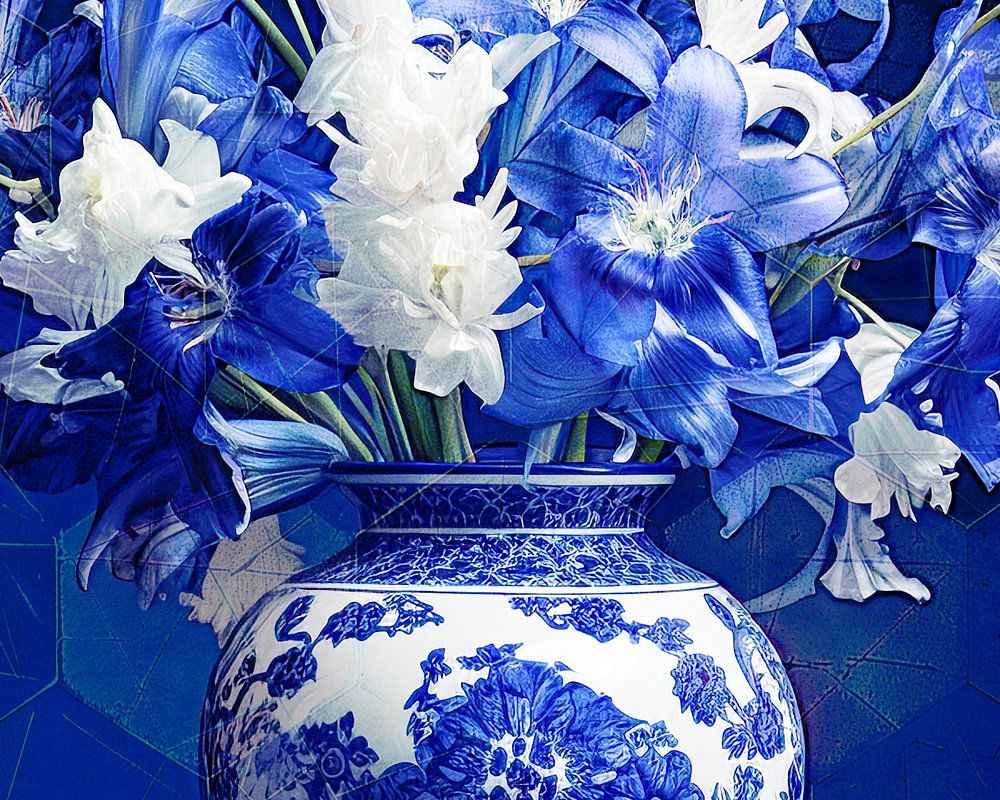 De diepe blauwtinten, gecombineerd met delicate witte accenten, zorgen voor een indrukwekkende en rustgevende toevoeging aan elke ruimte.