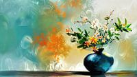 Dit digitale kunstwerk toont een levendig boeket bloemen in een blauwe vaas met een speelse abstracte achtergrond. De kleurrijke bloemen schitteren in de vaas en brengen frisheid en leven in de kamer. De abstracte achtergrond geeft de scène een zekere lichtheid en fantasie, terwijl de levendige kleuren een positieve en energieke stemming creëren.