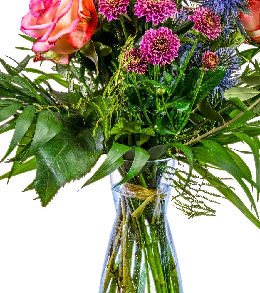 Boeket bloemen in een glazen vaas op een witte achtergrond