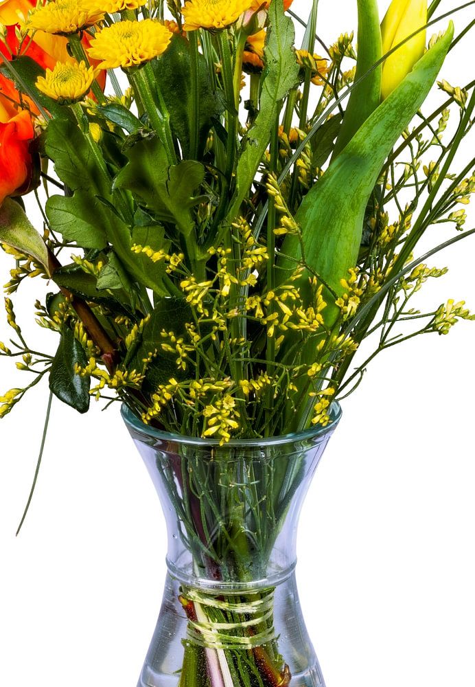 Boeket bloemen in een glazen vaas op een witte achtergrond