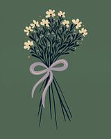 Schattige illustratie van een boeket met crèmekleurige bloemen en een violet lint op een saliegroene achtergrond.