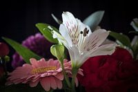 Een close-up van een boeket bloemen tegen een zwarte achtergrond