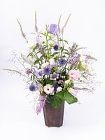 Boeket paarse, roze en witte bloemen uitgelicht tegen een lichte achtergrond. Door deze mooie tinten bloemen kleurt het mooi als een geheel, en straalt het werk rust uit.