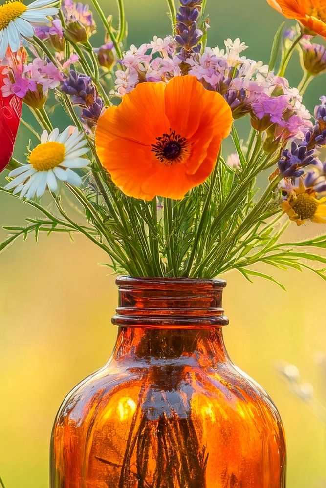 Een fleurig boeket bloemen ontvouwt zijn kleurenpracht in een warme, bruine glazen schaal. De zachte pastelkleuren en levendige accenten brengen een vleugje levensvreugde en natuurlijkheid in elke kamer. Dit arrangement is perfect voor de woonkamer, waar het meteen de aandacht trekt en een uitnodigende sfeer creëert.