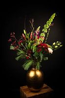 Koop dit bloemen kunstwerk Boeket rode bloemen n een gouden vaas van Marjolein van Middelkoop op canvas, aluminium dibond, (ingelijste) fotoprint, behang en ArtFrame, op maat geprint in Fine-Art kwaliteit.