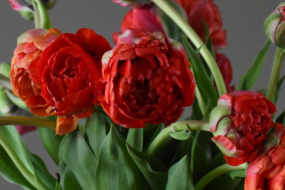 Mooi boeket rode papagaai tulpen op de vaas tegen een prachtige licht bruine achtergrond.