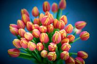 Boeket rood-gele dansende tulpen in close-up, is een vrolijk, kleurrijk boeket met deze Hollandse voorjaarsbloeiers tegen een bijpassende blauwe achtergrond.