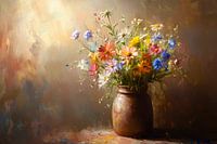 Vanuit een rustieke vaas vol bloeiende weidebloemen ontvouwt zich een levendig kleurenspel. De zachte penseelstreken roepen een harmonieuze combinatie op van helderblauw, levendig geel en delicaat wit. Licht en schaduw dansen samen en geven de compositie een dromerige, bijna magische sfeer. Een vleugje natuur dat de zintuigen betovert.
