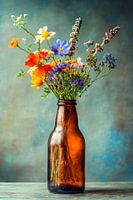 Een bloemstuk in zachte kleuren doet denken aan warme zomerdagen en frisse natuur. Het harmonieuze arrangement van heldere bloemen in een rustieke glazen fles brengt levendigheid en een uitnodigende sfeer in elke woonruimte. Perfect voor de woonkamer, waar het dient als middelpunt voor gezellige uurtjes en ontspannen avonden.