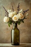 Delicate, romige rozen in combinatie met een vleugje lavendel voegen elegantie toe aan elke kamer. Dit bloemstuk schittert in een vintage groene glazen pot en brengt warmte en een vleugje natuur in de woon- of slaapkamer. Een harmonieus samenspel dat de zintuigen stimuleert en een ontspannen sfeer creëert.