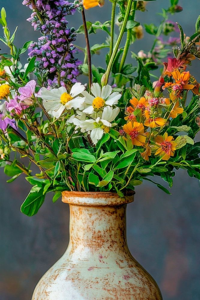 Een stralend arrangement van kleurrijke bloemen ontvouwt zich in een rustieke vaas. De levendige kleuren en verschillende texturen roepen lentegevoelens op en geven elke kamer een frisse touch. Dit kunstwerk zou perfect passen in een woonkamer om een uitnodigende en gezellige sfeer te creëren.