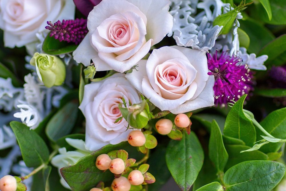 Boeket van roze rozen in de bos met verschillende versieringen.