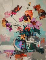 Een sober kunstwerk van een boeket met veldbloemen dat in een glazen vaas is gezet. Taupe tint achtergrond met roze rode en rode bloemen.