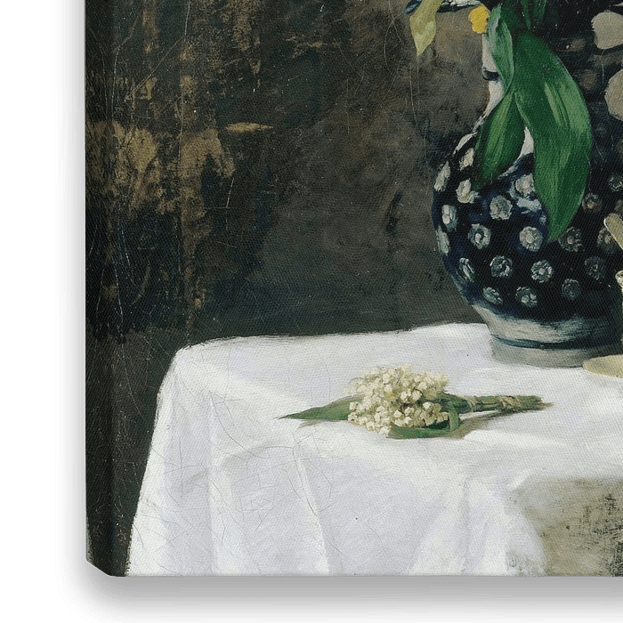 Een uitdagend motief in de vorm van een veelkleurige, gemengde bos wilde bloemen is hier eenvoudig en sentimenteel berouwvol. In het voorjaar van 1868 hadden de schilders Scholderer en Thoma Courbet in Parijs bezocht en vol enthousiasme een tentoonstelling van zijn werk bezocht. Met Courbet's stillevens vers in het geheugen schilderde Thoma bij zijn terugkeer in München een serie bloemstukken met vrije, vloeiende penseelstreken en donkere achtergronden. Op de tafel staan meestal extra voorwerpen - glazen, boeken, bekers - die een verhalend element toevoegen dat Thoma's werk onderscheidt van dat van zijn rolmodel.
