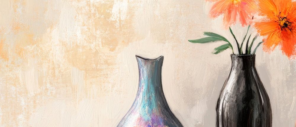 Zachte kleuren en elegante vazen creëren een harmonieuze sfeer, terwijl frisse, heldere bloemen accenten zetten. Deze compositie vangt de essentie van tijdloze schoonheid en verspreidt joie de vivre. Ideaal voor de woonkamer, het geeft de kamer een vleugje stijl en warmte die uitnodigt om te blijven hangen. Perfect voor gezellige of ontspannen momenten.