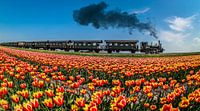 Stoomtreintje Hoorn-Medemblik gefotografeerd bij Twisk met de tulpen op de voorgrond.