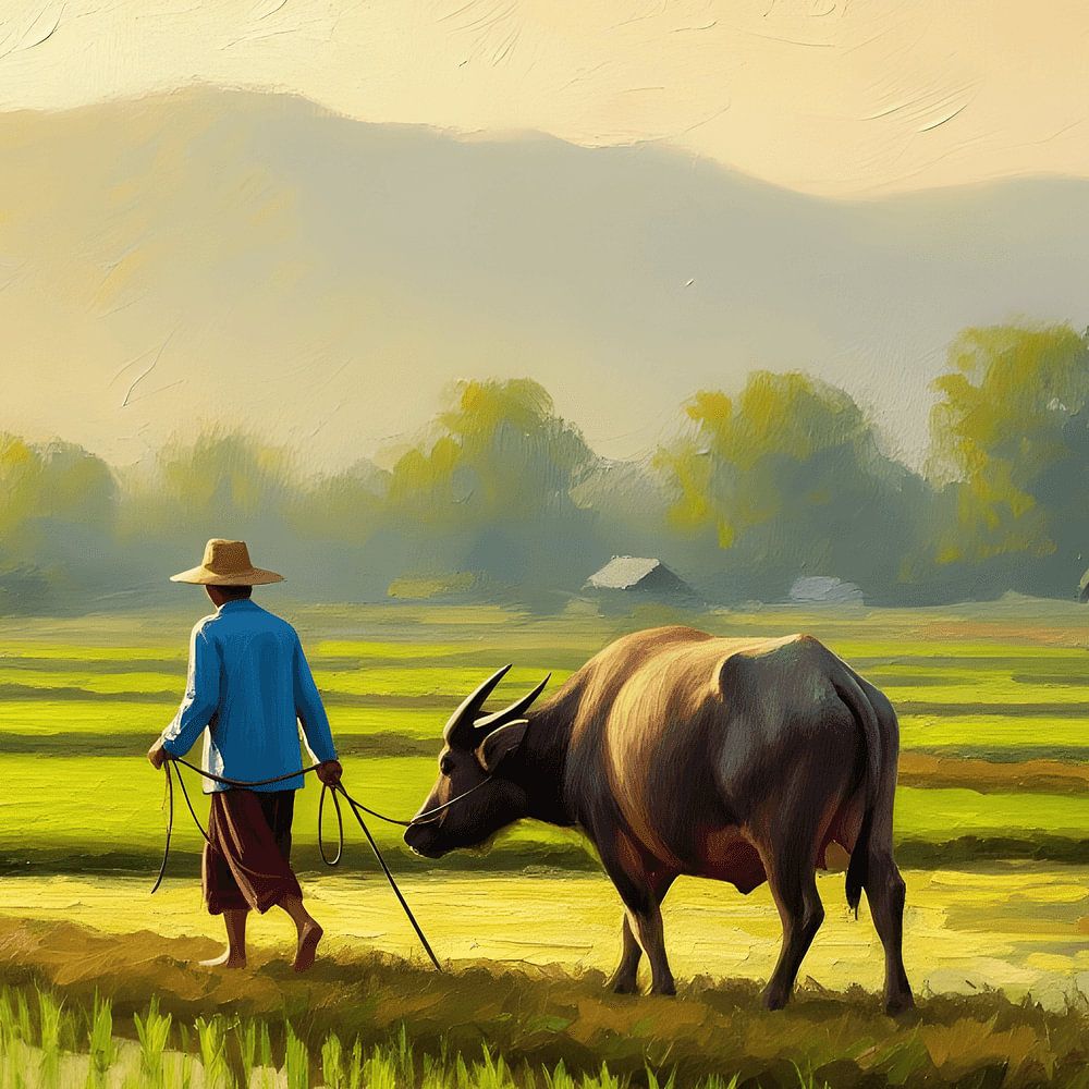 "Boer en de buffel" is een origineel olieverfschilderij dat het serene ritme van het traditionele plattelandsleven vastlegt. In dit kunstwerk loopt een boer samen met een buffel over een zonovergoten veld, de belichaming van harmonie tussen mens en natuur. De warme gloed van de ochtend- of late namiddagzon schijnt over het tafereel en werpt zachte gouden accenten op weelderig groene rijstvelden en glooiende heuvels in de verte.