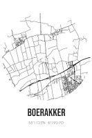 Zwart-witte landkaart, stratenplan of plattegrond van Boerakker. Boerakker is gelegen in de gemeente Westerkwartier, provincie Groningen. Op de stadskaart zijn alle openbare wegen in Boerakker opgenomen. Verder is de kaart voorzien van de coördinaten van het centrum van Boerakker.