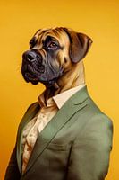 Een majestueuze Boerboel wiens imposante verschijning en gespierde bouw het best tot hun recht komen in een elegant pak. Zijn alerte, ontspannen blik en opvallende, brede snuit stralen zowel kracht als intelligentie uit. Deze unieke mix van elegantie en kracht komt perfect tot zijn recht tegen de felgele achtergrond.