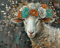 Boerderij Portret | Schaap - Het schilderij kenmerkt zich door een gedetailleerd portret van een schaap, gekroond met een kleurrijk bloemmotief. De stijl is een verfrissende mix van realisme en abstractie met een rijke textuur en spatten van goud accenten. Het kleurenpalet bestaat uit aardse tonen en levendige turkoois en oranje nuances, die een boeiend contrast vormen met de donkere achtergrond.