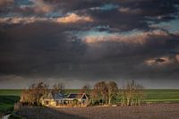 Boerderij achter de Friese Waddendijk tussen Oude Bildtzijl en Koehoal met een zware herfstlucht vol gekleurde wolken waar nog net de late namiddag zon doorheen schijnt om het landschap een oranje gloed te geven.