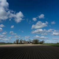 Boerderij in de provincie Groningen, bij het dorpje Schouwerzijl. Aardappelruggen op de voorgrond.
