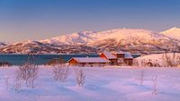 Winter in noord Noorwegen, in de provincie Troms, nabij de stad Tromsø. We zien een typisch Noorse boerderij die aan de kust ligt.