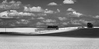 Een zwart-wit foto van een boerderij tussen de graanvelden in de Palouse regio, gelegen in de staat Washington in het noordwesten van de Verenigde Staten.