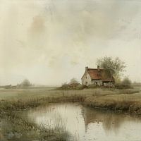 Boerderij met Rood Pannendak | Rustig Platteland met Boerderij - Op dit landschap schilderij zie je een rustige boerderij met een rood pannendak, omringd door een weids groen veld en een kalme vijver die de serene sfeer van het platteland weerspiegelt.