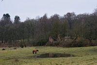 Ik heb deze foto gemaakt op de Veluwezoom in de buurt van Rheden en Arnhem. De ruïne wat je ziet was vroeger boerderij Hendrikhuizen waar tegenwoordig ook een observatiepunt is om wild te spotten, links achteraan zie je nog een paar damherten te grazen. Het weiland wat je ziet was vroeger waarschijnlijk een boerenerf dat bij de boerderij hoorde. Als je tussen de bomen door kijkt zie je nog een stuk weiland liggen. Het paard dat je ziet is waarschijnlijk een IJslandse paard dat op de Veluwezoom vrij rond kan lopen. De poel dat je ziet weet ik niet of het van nature op deze plek hoort te liggen, het trekt wel dieren aan om te gaan drinken.