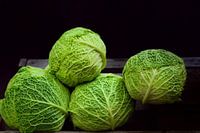 Vier kroppen boerenkool liggen naast elkaar tegen een donkere achtergrond