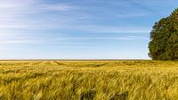een tarwe veld met de sporen van de trekker. Heldere blauwe lucht en een mooie donker groene boom. Een typisch gekleurd polder beeld wat je in het Groningse land regelmatig tegenkomt.