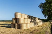 Na harde arbeid staan de balen netjes klaar voor transport. Goudgeel land en een strakke blauwe lucht tekenen het mooie Nederlandse landschap.