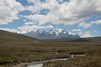 Nr Conococha Peru. A river runs through the bofedales peatlands at the base of the mountains of the Cordillera Blanca. The peatlands play an important role in the cleansing of the waters from the glacier.