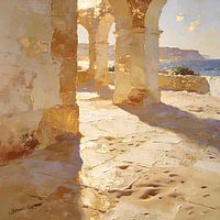 Oude, afbrokkelende bogen rijzen majestueus op in een zonovergoten landschap, hun verweerde stenen badend in warm, gouden licht. Zonlicht stroomt door de openingen en werpt lange, dramatische schaduwen over de ruwe, zanderige grond, waardoor de ruwe oppervlakken en plekken van verval worden geaccentueerd. Elke boog, versleten door de…