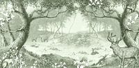 Bohemian bos met bomen in mono tint vintage groen. Met edelhert, konijn, beren en eekhoorn.
