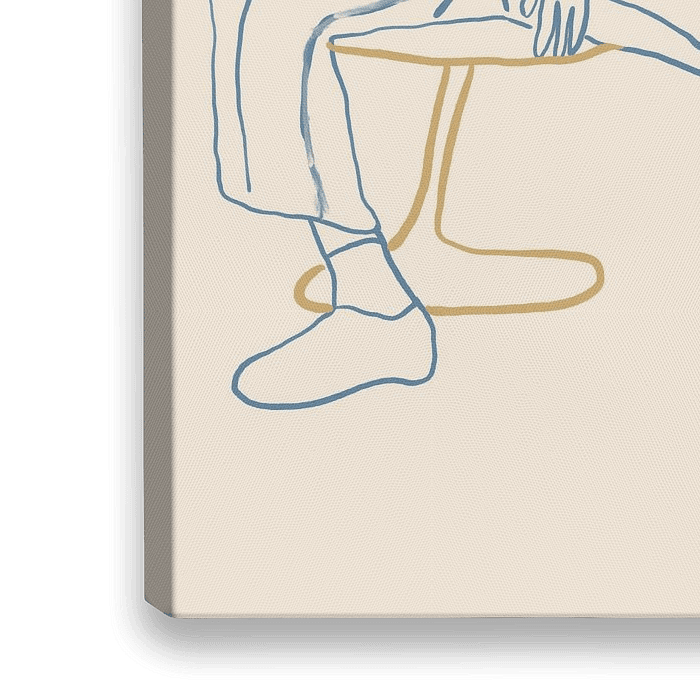 Bohemian abstracte illustratie in blauw en okergeel: portret van een meisje met een gestreepte broek op een stoel, line art.