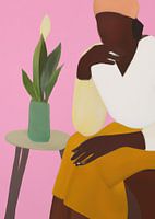 Bohemian illustratie van een zwarte vrouw met een plant in pastelkleuren. Bruin, zwart, geel, wit, groen en roze.
