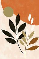Deze minimalistische botanische illustratie combineert abstractie en natuurlijke vormen. Gestileerde bladeren in zwart, bruin en olijfgroen contrasteren met een warme oranje en beige achtergrond, wat een herfstsfeer oproept. Geometrische cirkels voegen moderniteit toe, terwijl organische vormen natuurlijke sereniteit uitstralen. Het evenwichtige samenspel van kleuren, vormen en texturen creëert een rustgevend geheel. Dit boho-chic kunstwerk verenigt eenvoud en natuurlijke elementen in een tijdloos, kalmerend en visueel aantrekkelijk ontwerp.