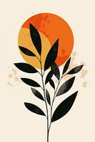 Deze minimalistische botanische illustratie combineert abstractie en natuurlijke vormen. Zwarte bladsilhouetten contrasteren met een levendige oranje en gele cirkel, die een zonsondergang suggereert. De gestileerde planten stralen sereniteit uit, terwijl de warme kleuren energie oproepen. Subtiele texturen geven het werk een handgemaakt karakter. Dit boho-chic kunstwerk verenigt eenvoud en natuurlijke elementen in een tijdloos ontwerp dat rust en inspiratie uitstraalt. Het roept verbondenheid met de natuur op en nodigt uit tot reflectie over de schoonheid van eenvoudige vormen en de dagcyclus.
