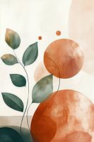 Dit serene kunstwerk combineert abstracte botanische elementen met geometrische vormen. Groene bladeren contrasteren met terracotta cirkels, wat balans tussen natuur en abstractie creëert. De minimalistische stijl en beperkte kleurenpalet stralen rust uit, terwijl organische lijnen groei suggereren. Het werk ademt een boho-chic esthetiek met aardse tinten die verbondenheid met de natuur oproepen. Deze illustratie nodigt uit tot reflectie over de schoonheid van eenvoud en natuurlijke harmonie, en wekt een gevoel van kalmte en contemplatie op.