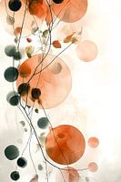 Dit etherische kunstwerk combineert abstracte botanische elementen met zachte geometrische vormen. Delicate bladeren en takken dansen tussen oranje en groene cirkels, wat seizoensverandering en beweging evoceert. Waterverf-texturen en transparante lagen creëren diepte, terwijl fijne zwarte lijnen structuur bieden. Het serene, boho-chic werk vervaagt de grens tussen abstractie en natuur, en nodigt uit tot reflectie over natuurlijke schoonheid en levensovergangen, waarbij het een gevoel van rust en harmonie oproept.
