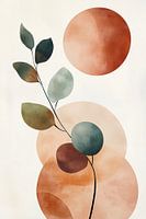 Dit serene kunstwerk verenigt abstracte botanische elementen met zachte geometrische vormen. Een sierlijke tak met groene bladeren contrasteert met warme terracotta en beige cirkels, wat natuurlijke balans evoceert. Waterverf-texturen en subtiele kleurovergangen creëren diepte en zachtheid. Het minimalistische ontwerp nodigt uit tot reflectie over natuurlijke schoonheid. Deze boho-chic illustratie weerspiegelt seizoenscycli en de harmonie tussen organische en abstracte vormen, waarbij het kalmte en evenwicht uitstraalt.