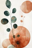 Dit serene kunstwerk combineert abstracte botanische elementen met geometrische vormen in een harmonieuze compositie. Zachte groene bladvormen contrasteren met warme terracotta cirkels, wat balans tussen natuur en abstractie creëert. De minimalistische stijl en het beperkte kleurenpalet zorgen voor rust, terwijl organische lijnen en waterverf-texturen beweging en groei suggereren. Het werk straalt een boho-chic esthetiek uit met aardse tinten die verbondenheid met de natuur oproepen. Deze illustratie nodigt uit tot reflectie op de schoonheid van eenvoud en de subtiele overgangen in de natuur, waarbij elk element in harmonie bestaat met de anderen.