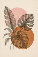 Een moderne compositie van tropische bladeren in potloodtextuur, harmonieus gecombineerd met transparante cirkels in terracotta en roze tinten. Deze minimalistische stijl brengt een warme, boho sfeer die rust en balans uitstraalt.