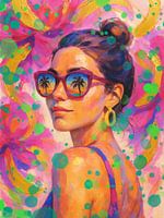 Stap in een tropische dagdroom met dit levendige portret van een stijlvolle vrouw met een oversized zonnebril die wuivende palmbomen weerspiegelt. Omringd door gedurfde verfspatten vangt dit kunstwerk de zorgeloze geest van de zomer en de moderne mode. Perfect om kleur toe te voegen aan je interieur, of het nu een strandhuis, boho slaapkamer of creatieve studio is. Een speelse mix van pop-art en tropische sferen - dit kunstwerk brengt zonneschijn in elk interieur.