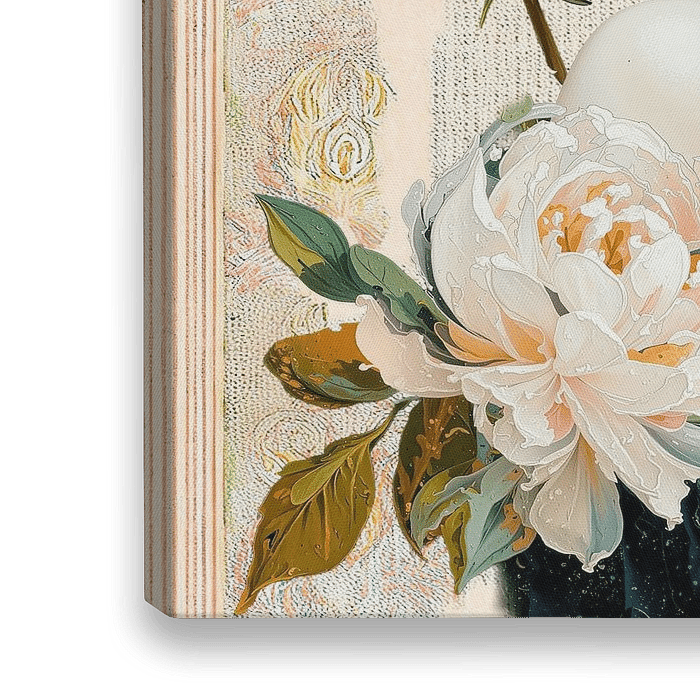 Koop dit schilderij Boho Chic portret van een vrouw met pioenrozen in retro stijl van Studio Pieternel als reproductie op canvas, aluminium dibond, (ingelijste) fotoprint, behang en ArtFrame, op maat geprint in Fine-Art kwaliteit.